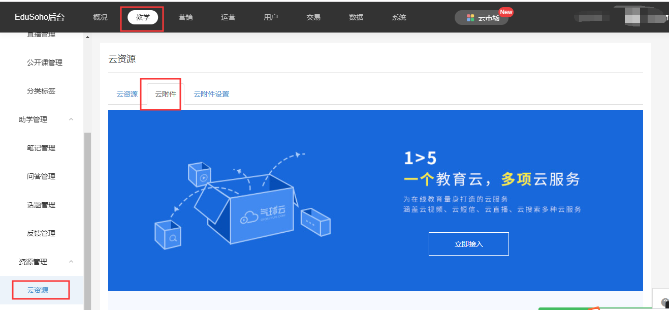 路径:【管理后台】-【教学】-【资源管理】-【云资源】-【云附件】;