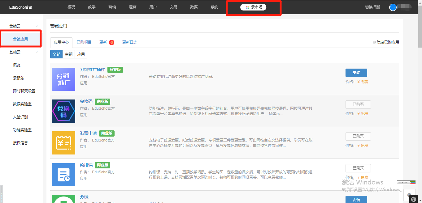 路径:【管理后台】-【教育云】-【ES应用】-【会员专区】,ES商业版免费安装使用,开源版暂不支持。