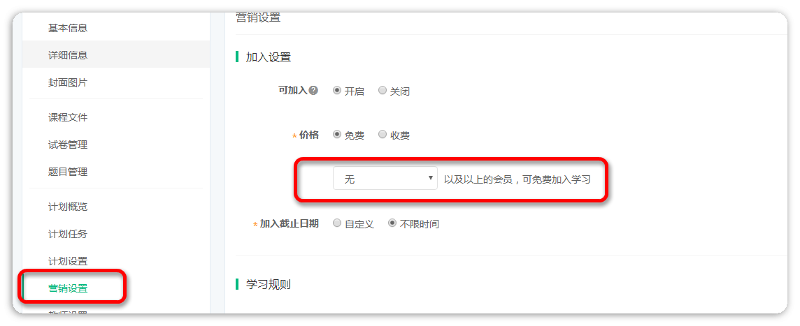 路径:【课程管理页】-【营销设置】,然后有会员身份的人就可以免费加入课程了~