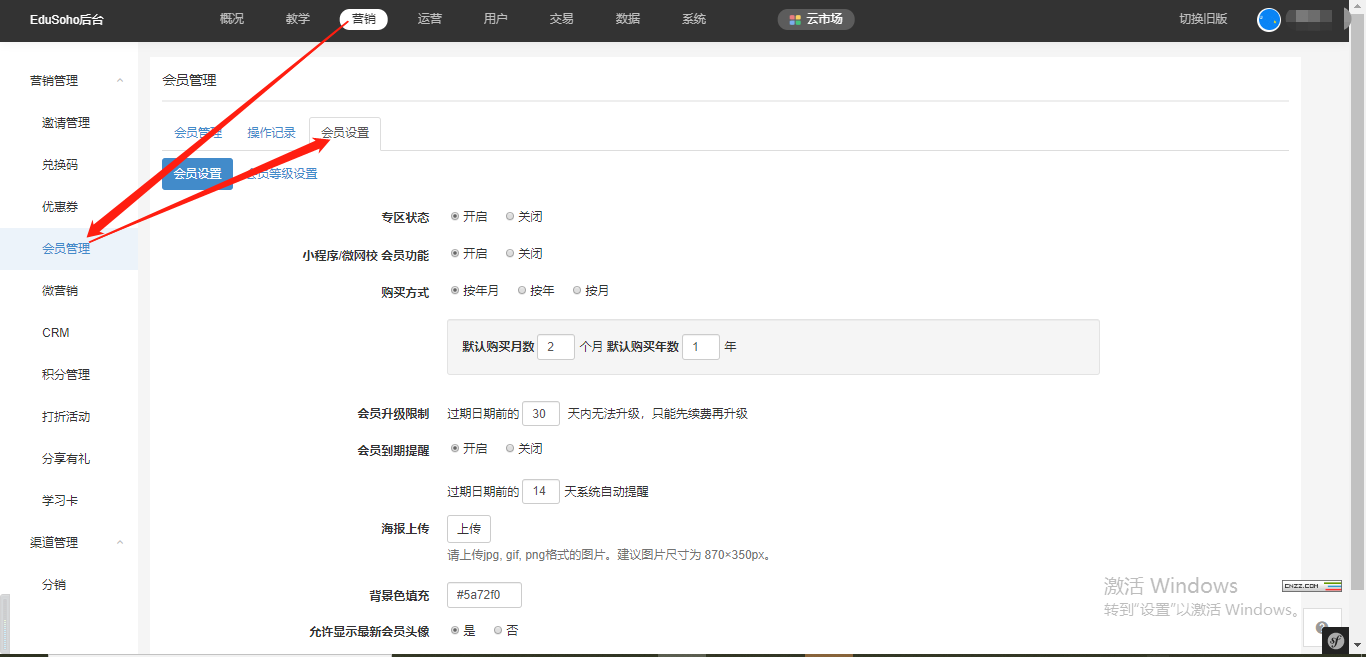 路径:【后台管理】-【营销】-【会员管理】-【会员设置】。