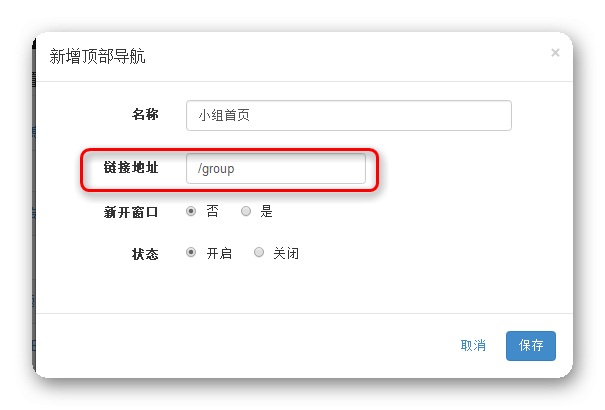 小组的地址是:域名/group;例如气球鱼小组的地址是http://www.qiqiuyu.com/group;到【运营】-【网校装修】-【站点配置】-【顶部导航】中,添加顶部导航,输入小组地址,访客即可点击导航访问小组。