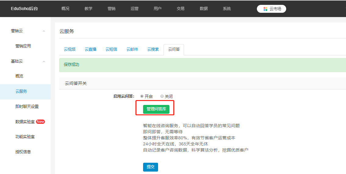 启用云问答后,可看到【管理问答库】的按钮,点击后即可到云问答管理页;