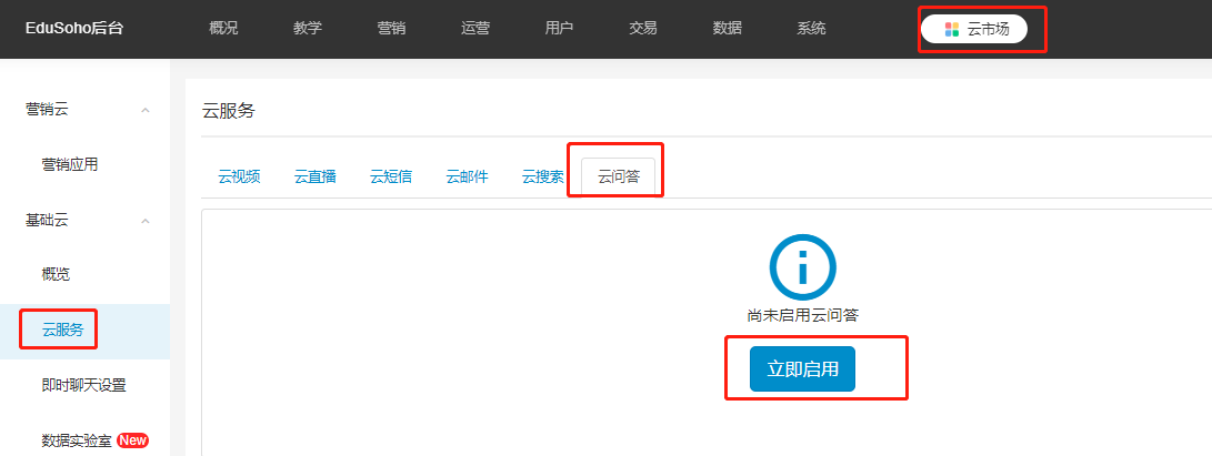 路径:【管理后台】-【云市场】-【云服务】-【云问答设置】中启用云问答。