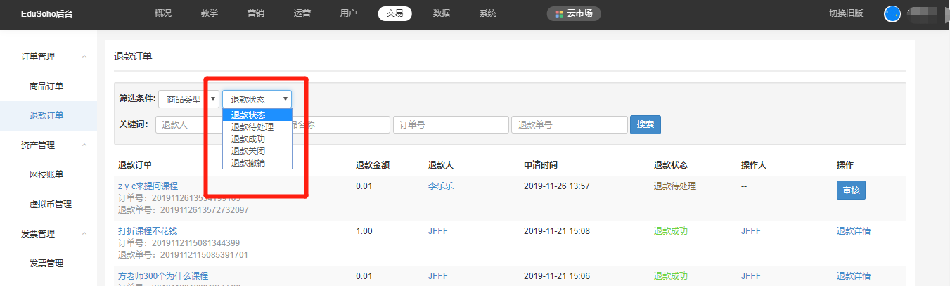 用户已申请:用户申请退款,网校未处理 退款成功:网校已经同意用户退款且退款成功(虚拟币退回虚拟币账户,现金需要网校线下退款,系统无自动退款功能) 退款拒绝:网校拒绝用户退款 退款撤销:用户自己撤销退款申请