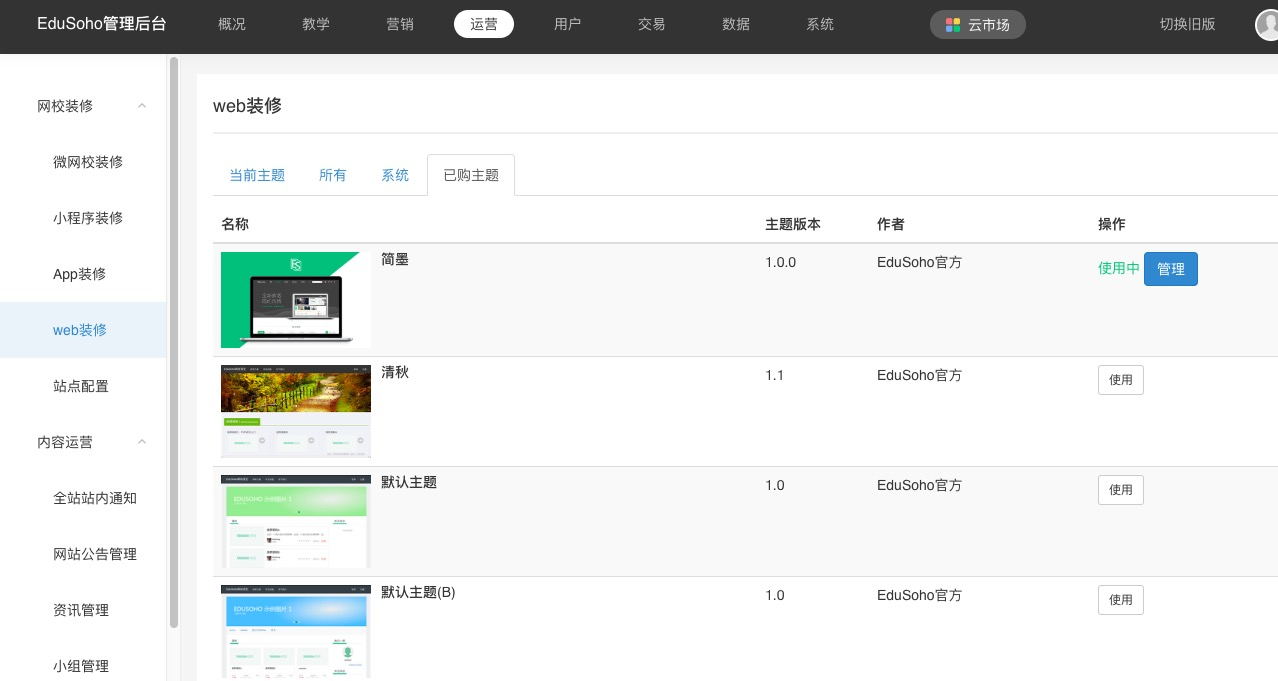 路径:【管理后台】-【运营】-【web装修】-【已购主题】,更换主题不影响网站的数据。