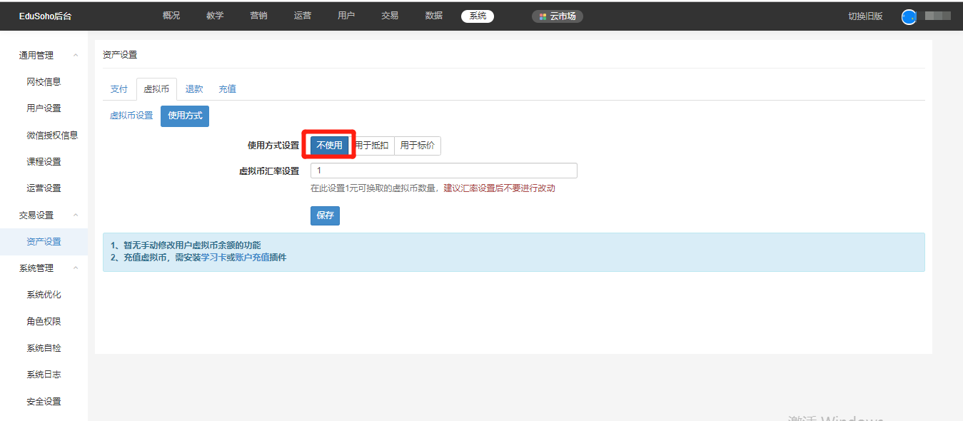 路径:【管理后台】-【系统】-【资产设置】-【虚拟币】-【使用方式】。