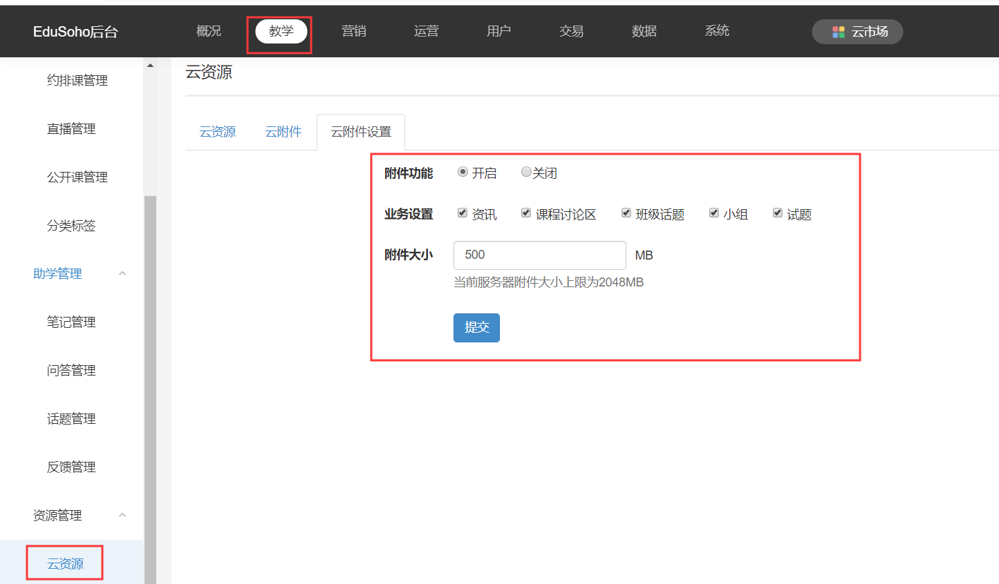 开启前提:接入EduSoho教育云并在网站后台开启云视频,即可免费使用云附件功能; 开启路径:【管理后台】-【教学】-【云资源】-【云附件设置】中设置
