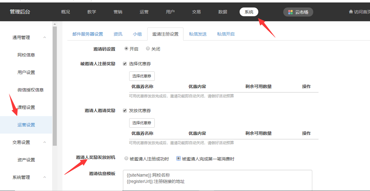 系统的另一个功能--邀请注册,可以设置成功邀请好友注册,好友在网站购买课程后,给邀请人返优惠券。