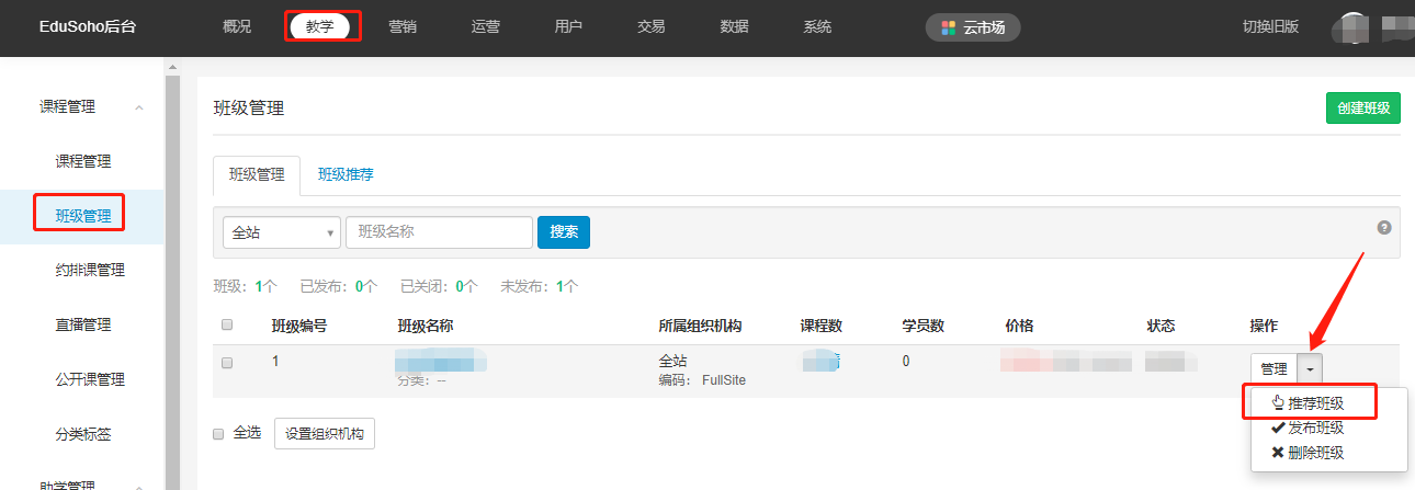 路径:【管理后台】-【教学】-【班级管理】-【操作】,设置推荐即可,推荐序号越小排名越前。