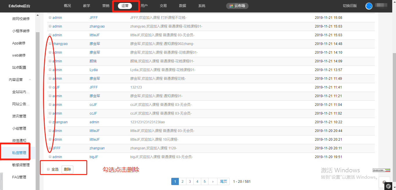 路径:【管理后台】-【运营】-【内容运营】-【私信管理】