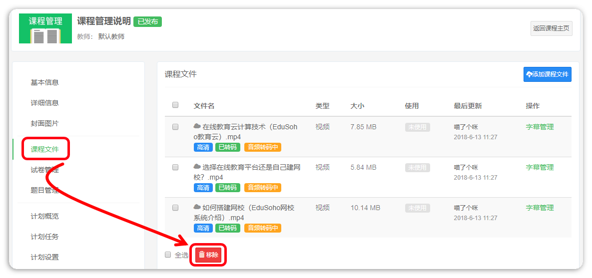 删除路径:【课程管理页】-【文件管理】;