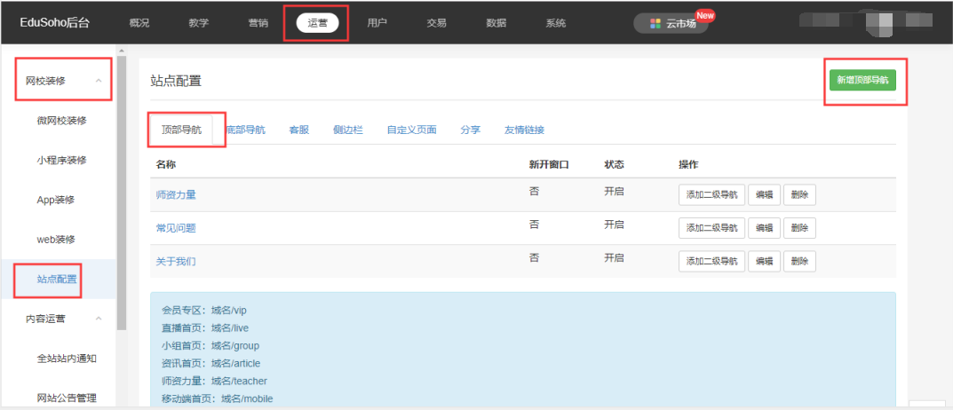 路径:【管理后台】-【运营】-【网校装修】-【站点配置】-【顶部导航】