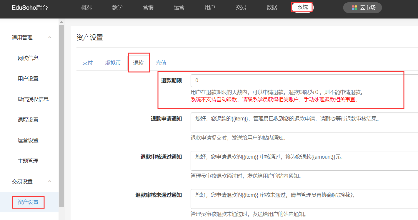 设置路径:【管理后台】-【系统设置】-【资产设置】-【退款】;