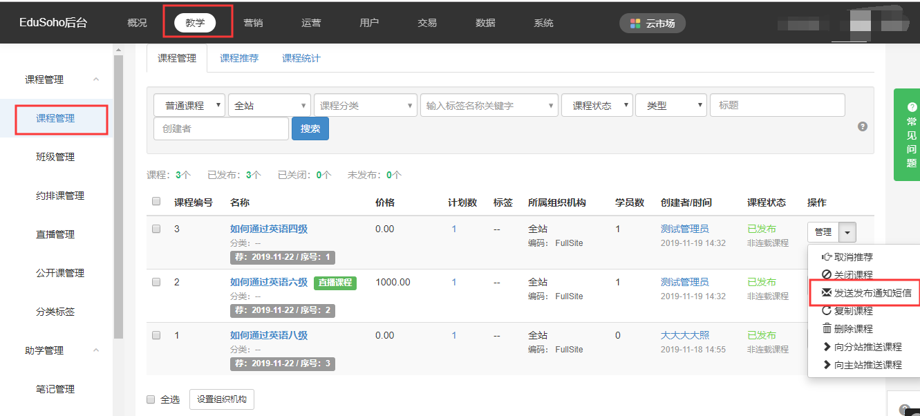 在【管理后台】-【教学】-【课程管理】-【管理】中发送课程发布的通知短信;