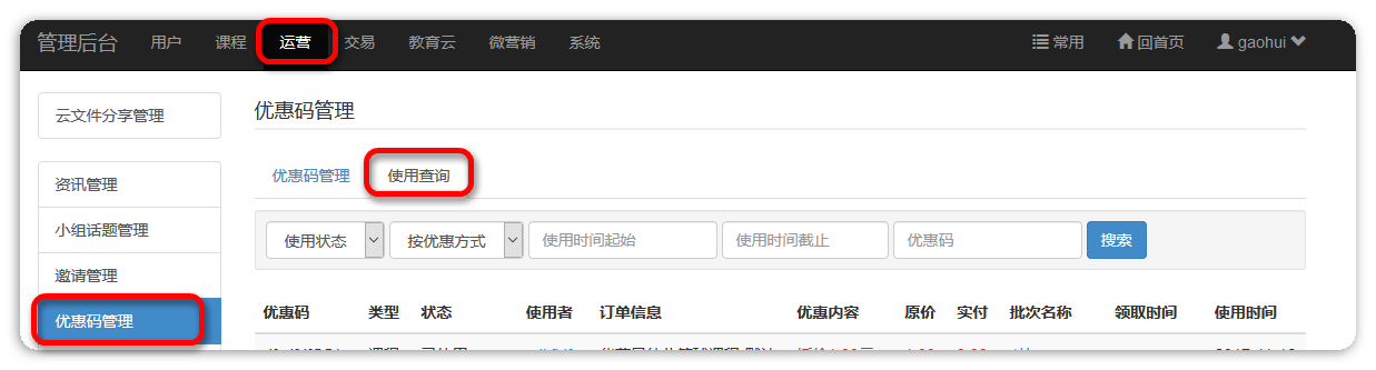 路径:【管理后台】-【运营】-【优惠码管理】-【使用查询】