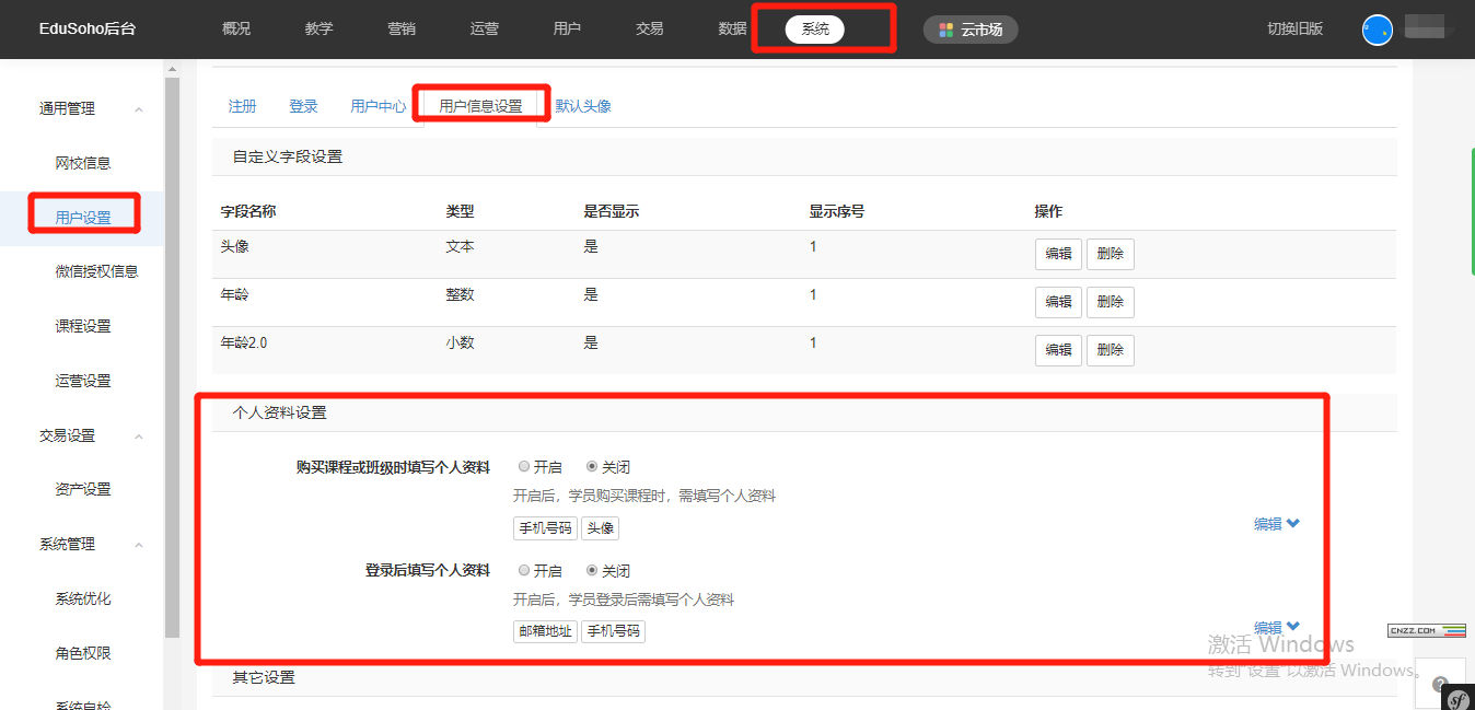 路径:【管理后台】-【系统】-【用户设置】-【用户信息设置】