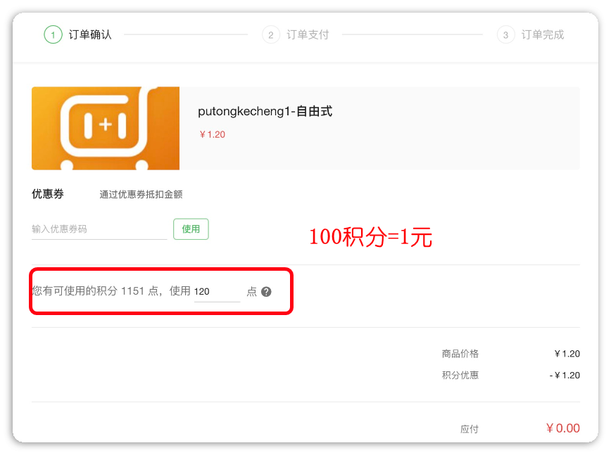 购买课程/班级/会员时,提交订单后进入付款页,可选择使用积分抵扣额度。