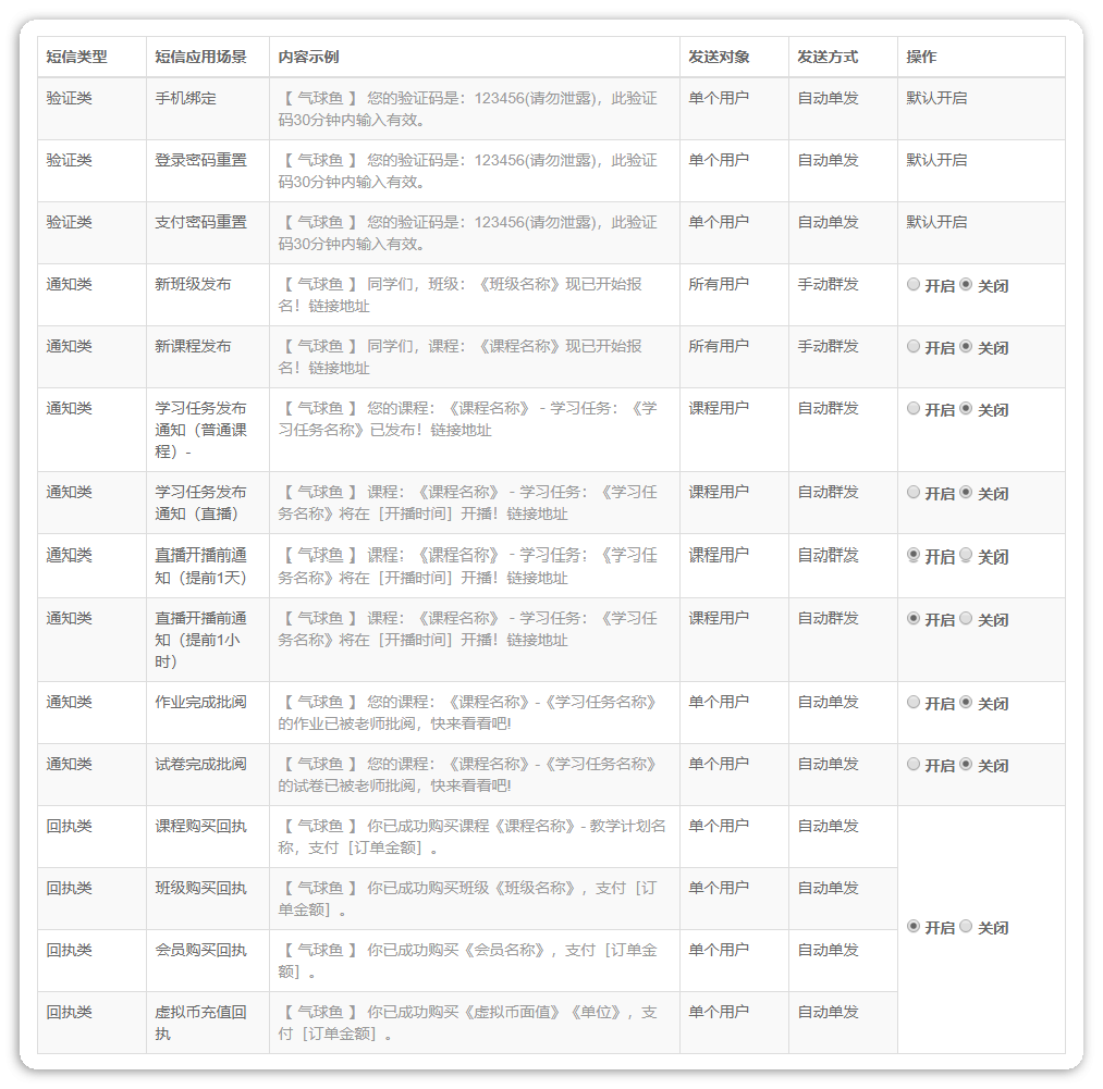 云短信是固定模板(【管理后台】-【云市场】-【基础云】-【云服务】-【云短信】-【设置】可查看模板),不能编辑,并且不能选择发送对象。