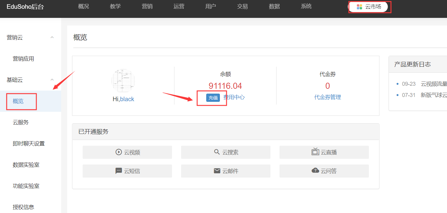 在【网校后台】-【云市场】-【概览】-【充值】点进去输入金额,可以使用支付宝支付 或登录ES教育云充值:open.edusoho.com