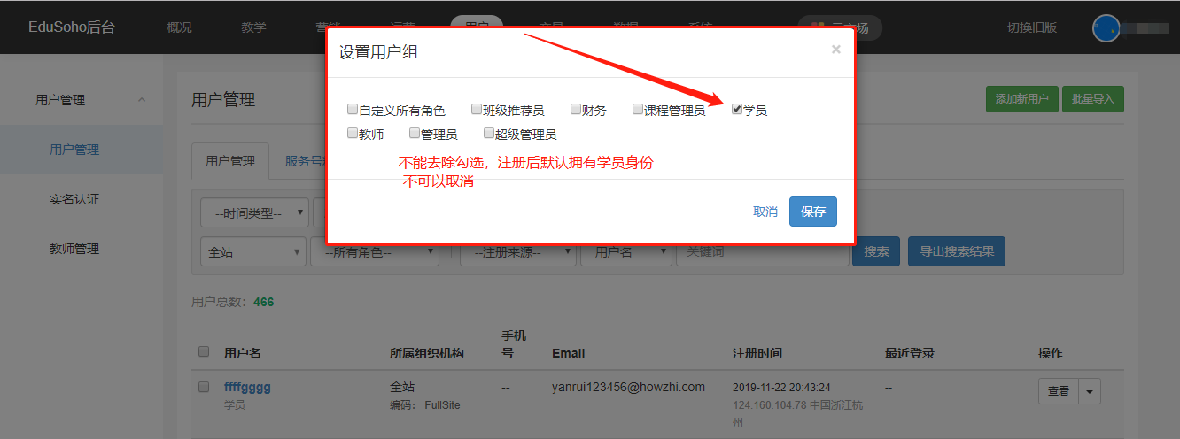注册用户默认为”学员“身份,任何一个用户在系统里都扮演着一个角色,ES系统将默认的最低角色定义为”学员“,所以不能勾选取消。