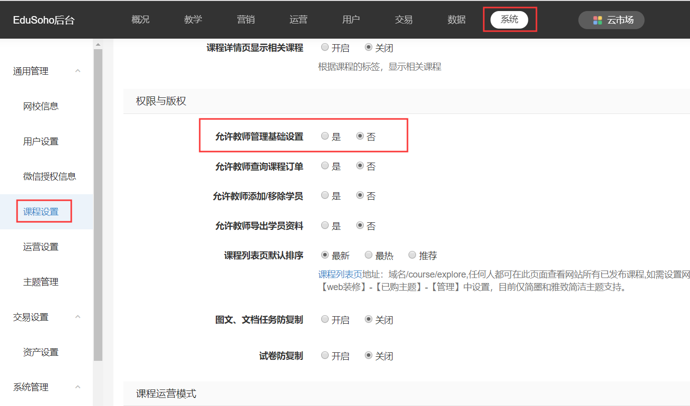 路径:【管理后台】-【系统】-【课程设置】-【课程】-【允许教师管理基础设置】,选择“是”,然后拉到页面最下方,保存设置即可。