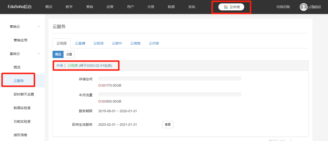 可以的,在网校【管理后台】-【云资源】-【云服务】-【云视频】中,可看到“升级”和“续费”按钮,点击升级即可升级云视频包。