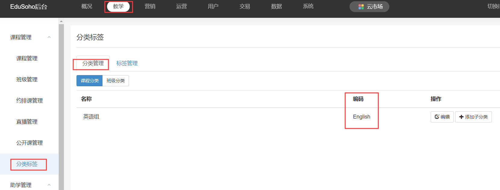 【管理后台】-【教学】-【分类标签】-【分类管理】中,可以看到各个分类的编码,这些编码是在创建分类的时候设置的,可以再次编辑修改,作用就是区分不同分类。