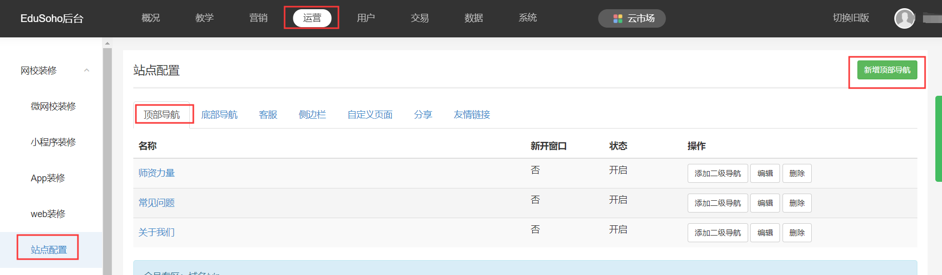 路径:【管理后台】-【运营】-【站点配置】-【顶部导航】