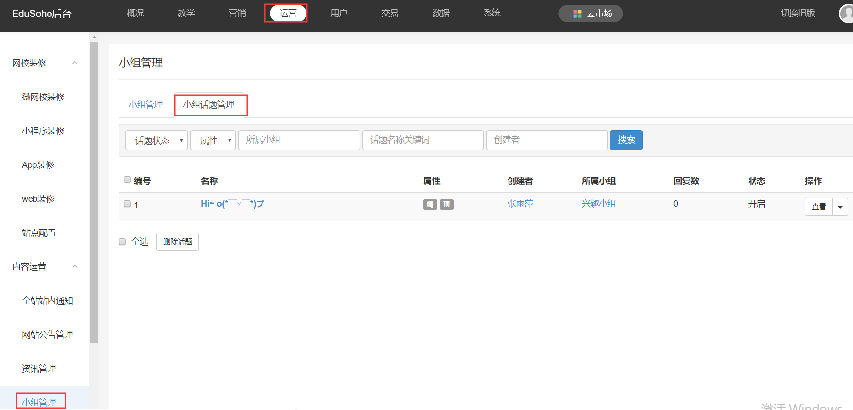 小组不支持删除,但是可以转移或关闭; 路径:【管理后台】-【运营】-【小组话题管理】。