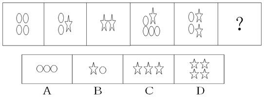 【解析】考查两种元素之间的换算。一个星星=三个圆圈,换算之后构成45678?的等差数列,答案为C。