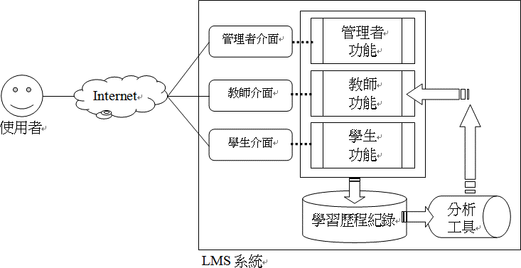 LMS 的功能包括各种教学活动管理、课程参与者管理(例如老师、助教、学生等)、课程管理、教材管理、作业/测验管理和学习历程等等。不同的使用者之权限也不同,使用 者身份可分为三类:课程管理者、教师、学生。教师可以兼具课程管理者和教师两种身份。 管理者需要的功能是设定课程相关资料,与学生互动较无关係。教师需要的功能是管理教 材、作业/测验和教学活动等等,与学生互动的部份,另外还能藉由学习历程,计算出学 生的学习样板(Learning Pattern),了解学生的学习状况。学生的话,主要是参与老师所设计的各种教学活动,例如:参与讨论区、缴交作业和测验等等。LMS 的系统架构图如图 1