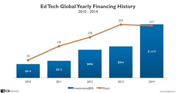 教育的投资处于一个快速增长期,14年的 16 亿美金 相比 13年的 9.4 亿美金,增长了 71%,但是投资数量有微微下降,2013年的成交数量 223 个,下降到 217 个。
