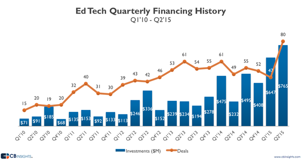 具体到 2015 年 Q2 季度,7.65 亿美元投资金额为历史最高,相当于 2014年一整年投资额度的 40%,同时曝光投资案子也有所增加,从 47 增加到 80 个。其中,最大一笔来自中国的家教 O2O 创业公司 —— 轻轻家教(1亿美元),由好未来领投,此前所有的投资方 IDG、挚信和红杉跟投。