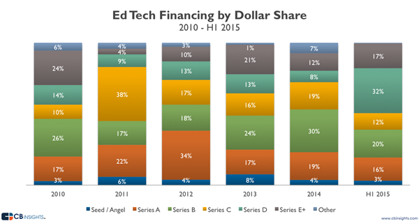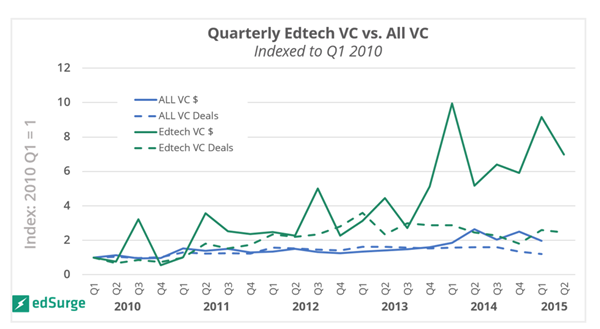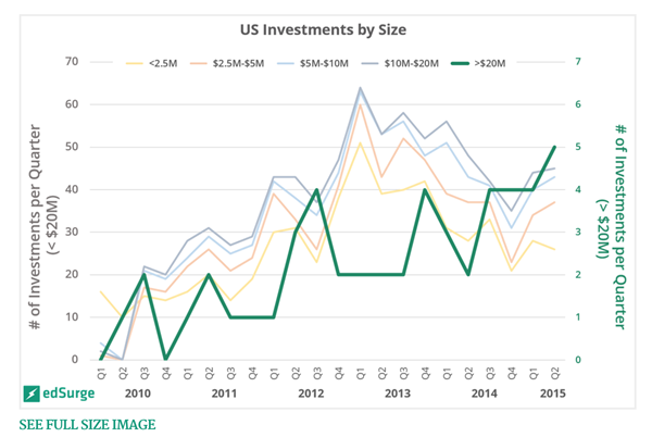 另外,在 Edsurge 报告中,还给出了一张从 2010 年 Q1 季度,在线教育投资比重占全球科技行业投资比重。可以看到的是,即使在线教育在过去5年内,投资金额增长的快,尤其是在2013年以后,但事实上增长率是非常慢的,而且对整体投资的影响还非常小。 整体来说,“investors seem to be taking a step back from the education industry in 2015”,如果用中国特色的话来说:“寒冬将至”。好未来在最新一期的财务会议上强调,新一个财年的投资将会集中关注战略投资,投资数量会减少,但是投资金额会增大,与全球市场动向不谋而合。另外,一些从业者也强调,要做强现金流。