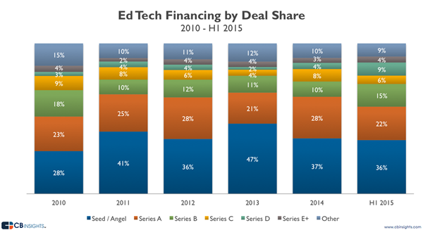 最近,CB Insight 发布了 2015 年全球在线教育领域 Q2 季度的报告:投资案子有将近 80 起,金额接近 7.65 亿美金。从整体趋势上看,教育投资数量正在下降,资本整体偏爱中后期项目。