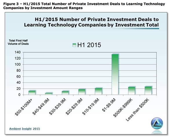 “早期项目数量减少,投资项目偏后期,且金额大”这个观点并不是第一次提出,Ambient Insight 数据也同时反映了这个现象。在 2000 年的时候,大约有 71% (43家) 的公司拿到了大于 1000 万美元的融资,到了 2004 年的时候,大约 45 家的公司拿到了超过 1000 万美元的融资,而在 2015 年的上半年,大概有 71 家公司的融资金额都超过 1000 万美元,占上半年所有案子总数的 27%。 另外就地区的投资表现来看,中国、印度和巴西表现最为显眼。在Ambient Insight 的统计里,2015 年上半年在中国共成交了 20个教育投资,金额在 7.9 亿美元,占到全球市场投资额的 32%。印度也表现十分突出,大概有 33 个在线教育公司拿到了大约 1.37 亿美元的融资,巴西的在线教育投资金额在 9700 万美元,而这个数字在 2013 年整年是 530 万美元。