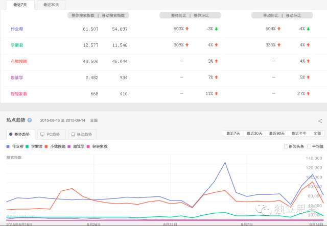 3)教育O2O的搜索量和他们线下扩张的策略关联度很大,是一城一地的打还是遍地开花的打是造成数据差异强相关的一个要素。还有一点就是谁的侧重点是存量用户,谁的侧重点是增量用户,对搜索量的影响也很大。