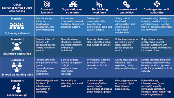 在2001年的研究中,经合组织提出了六种未来教育的图景,分别是:健全的官僚体系(Robust bureaucratic systems)、扩展市场模式(Extending the market model)、学校作为核心的社会中心(Schools as core social centres)、学校作为学习型组织(Schools as learning organisations)、学习者网络与网络社会(Learner networks and the network society)、教师流失-奔溃的情况(Teacher exodus–the meltdown scenario)。