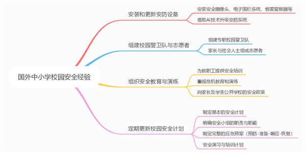 国外中小学在校园安全问题的应对上,有哪些经验值得我们学习和借鉴?通过思维导图了解本文的内容结构。