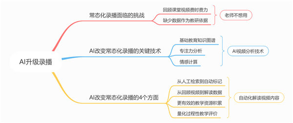 除了整堂课的视频没有标记(如课堂视频在某个时间段涉及的相关知识点)、回顾费时费力以外,常态化录播只有录制和播放功能,不能提供数据分析作为教研、教学管理的依据。