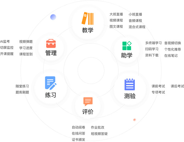 当然EduSoho的在线教育系统的功能还远不止这一个,还涵盖了上传课程、学生学习、考试、评价、互动、小组讨论等一系列功能应用。