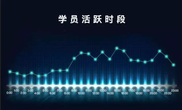 最新报告显示学员的学习活跃高峰时间有所调整,从三个时段变成四个时段:上午9点左右,下午1点左右,下午3点左右以及晚上9点左右,这说明,学员投入了更多的时间在在线教育的平台上。