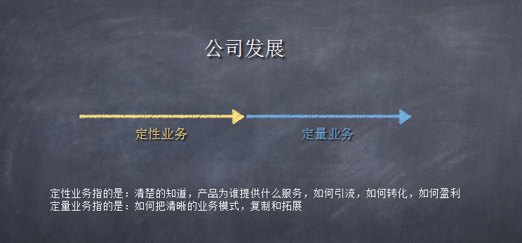 这两年我们一直处于定性业务阶段。定性业务也就是,清楚的知道,产品为谁提供什么服务,如何引流、如何转化、如何盈利。这不仅是一个推广问题,还是一个产品和运营的问题,当我们确定我们的业务是可以挣钱的、 确定的用户需求时,我才去花钱做定量业务,定量业务也就是,如何把清晰的业务模式,复制和拓展。