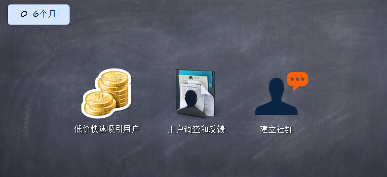 我们先来看第一个部分,0-6个月,我和马涛本身并没有什么背景,所以当时我们第一部分就是低价快速吸引用户。我们今天的产品价格是会员制,会员费是3980,最初的价格是99。我们非常清楚用一个比较低的价格可以快速吸引比较多的用户,然后将这些用户框到我们的社群中来,无论是QQ群还是微信群。最后,做用户调查和反馈,我们会从社群中与这些用户一一沟通,去确定他们是什么年龄的人,不是说他们的年龄层23-30岁,而是具体的年龄。而这个过程恰是十分重要,正因为我们知道我们用户是谁,我们才能制作具有针对性的产品以及营销方向,所以0-6个月第一件要做的事情是,快速低价吸引用户,并确定用户的身份。