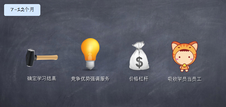 之前我提到我们涨了几次价格,增长趋势是这样的:最开始是99,第二次是499,第三次是980,第四次是1980,第五次是3480,最后是现在的3980.我们会发现,我们涨的这几次价格,用户依旧买账。因为我们并没有对标场景,去说因为竞争对手是什么样子,所以我们就做成这个样子。而是根据用户通过学习找到工作,达成学习目标的价值去衡量。而我们的用户转型互联网后的工资是在5000-8000之间,所以我们的价格也是合理的。