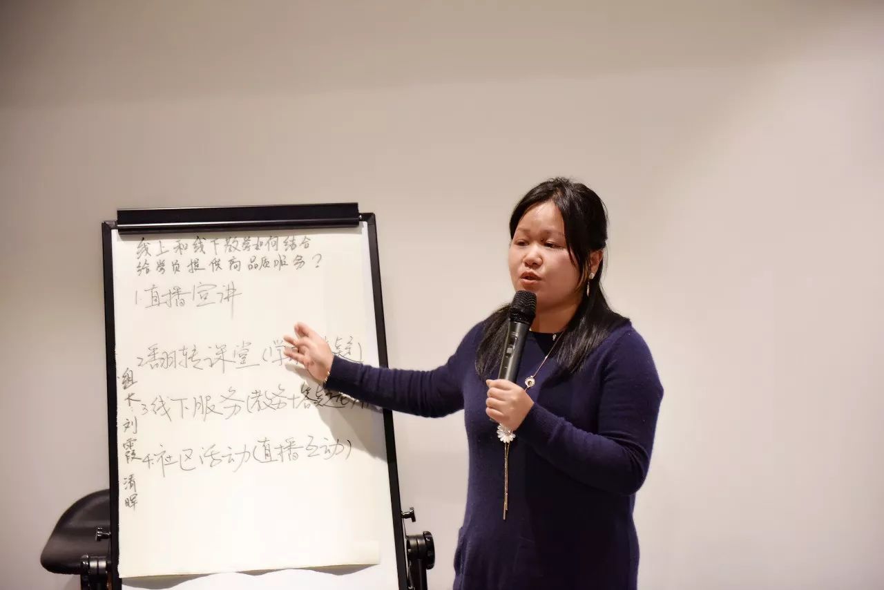 上海清晖在线网校负责人刘霞,就线上和线下如何结合的问题,给出直播宣讲、翻转课堂、线下服务和社区活动四个方法。