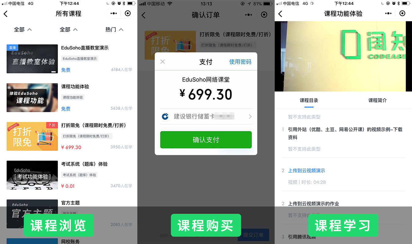 EduSoho小程序是EduSoho网校的小程序端,所有教学数据与网校同步,可以与网校的网页端、APP端和H5微微网校端一起,形网校的全渠道覆盖。