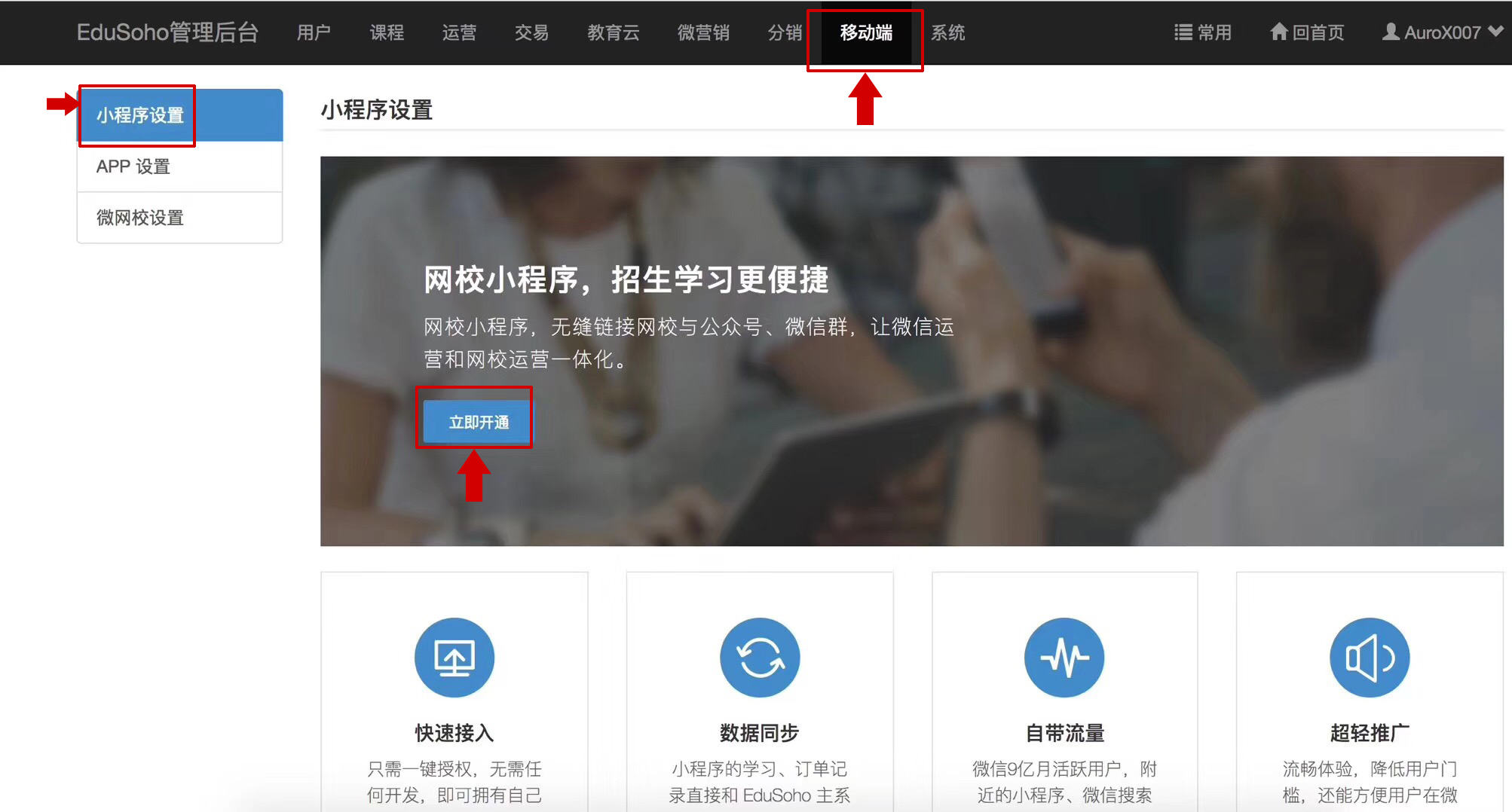 EduSoho 8.2.27 及以上的网校用户,只需一键授权,无需任何开发,即可拥有自己的网校小程序。