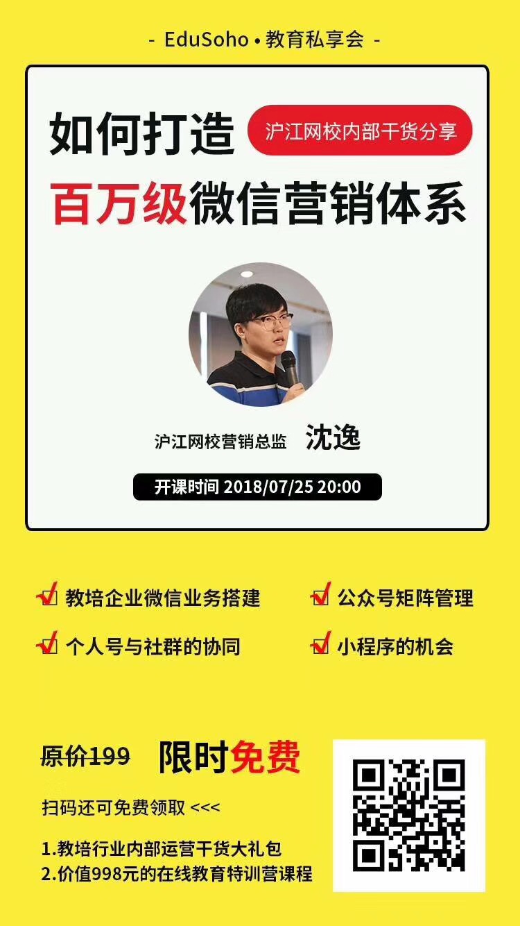 本次EduSoho教育私享会邀请到营收5.5亿的在线教育公司——沪江网校的营销总监沈逸谈一谈如何打造百万级微信营销体系。