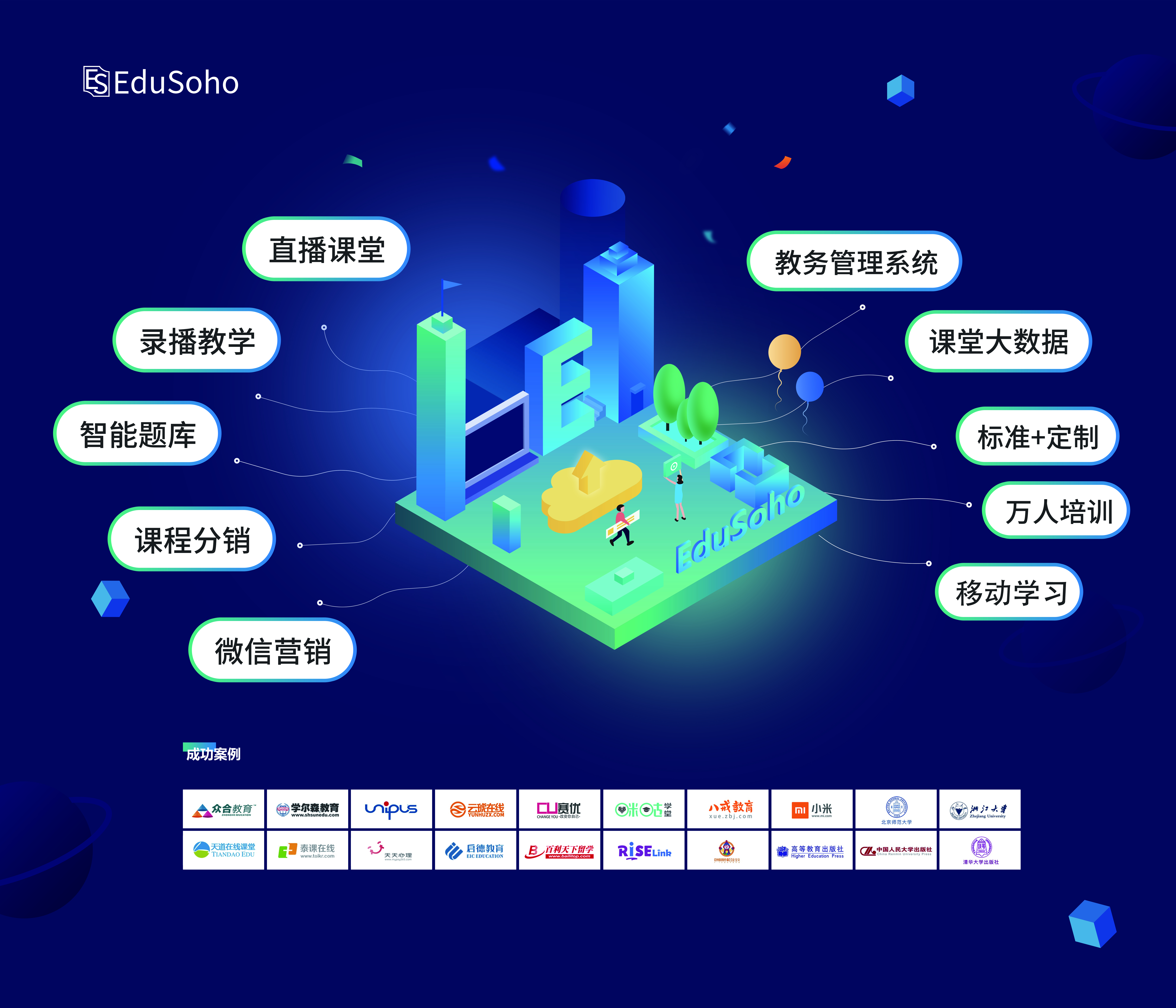 面对挑战,EduSoho多年来积极探索在线教育技术,以国家政策为导向,以多元创新研发为核心,深耕教育机构、高职院校、企业培训等多个在线教育应用领域,覆盖全年龄段学习需求,融汇教学、管理、招生三大核心功能,包括但不限于互动直播、教师管理、智能组卷、学员管理、教学工具等528项网校功能,苛求教与学的最佳体验,引领教学、营销、管理、云视频技术等一体化在线教育技术服务。